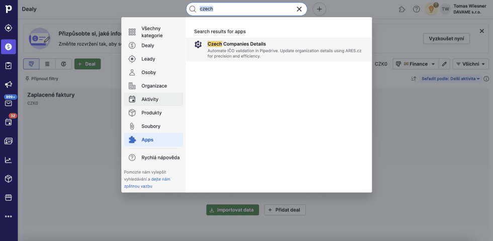 Jak napojit Pipedrive CRM na český obchodní rejstřík zdarma?