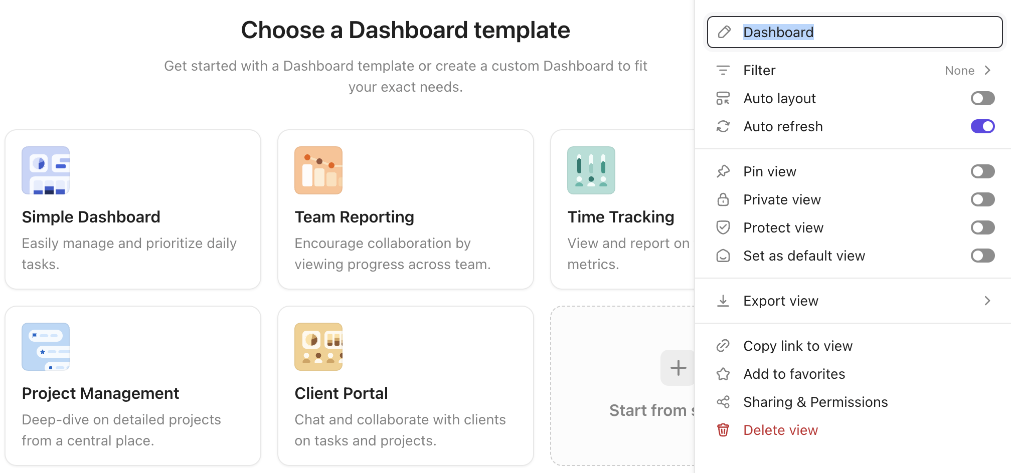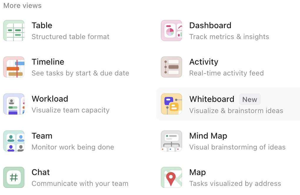 Zároveň si v ClickUp můžete vybrat z široké škály typů zobrazení pro jednotlivé složky a listy: list, board, gantt, calendar, timeline, mind map, table.