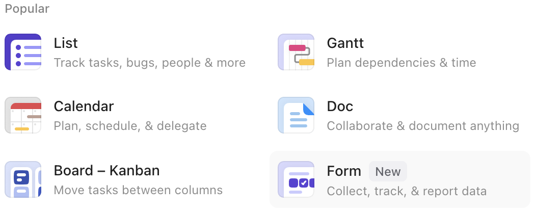 Obrázek: ClickUp – typy zobrazení