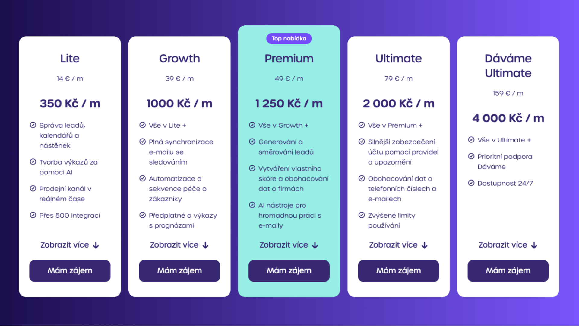 | Ideální pro | Rostoucí firmy s více obchodníky a manažery, které chtějí řídit výkon a plnění cílů, zefektivnit spolupráci, nebo potřebují pracovat s více odděleními či obchodními procesy. | |